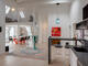 Køkken i åben forbindelse med opholdsstuen, med vindue, Udsugningsventilator, Elektrisk ovn, Induktionskogeplade, Kombination af køleskab og fryser, Opvaskemaskine, Kapsel-kaffemaskine, Barstol, fuldt udstyret med service og køkkenredskaber