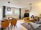 nou Bucătărie mobilată, cu fereastră, Combinație frigider/congelator, Mașină de spălat vase, Plită cu inducție, Cuptor electric, Ventilator extractor, Toaster, Kettle, Taburet de bar, dinnerware, kitchen utensils and equipment provided