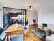 Cameră de zi / sufragerie cu canapea din piele și set de luat masa
